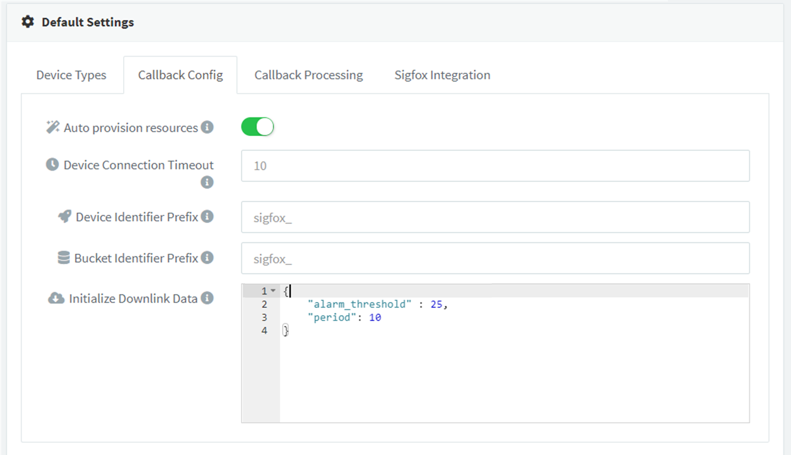 - Auto provision resources: Enable or disable automatic resource provisioning while receiving messages for non created devices of the same Sigfox "Device Type".
