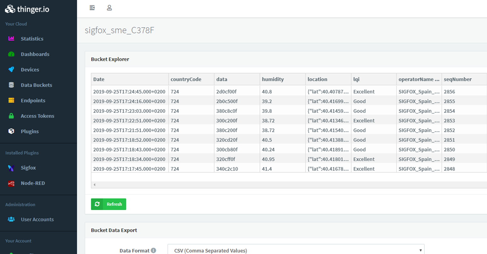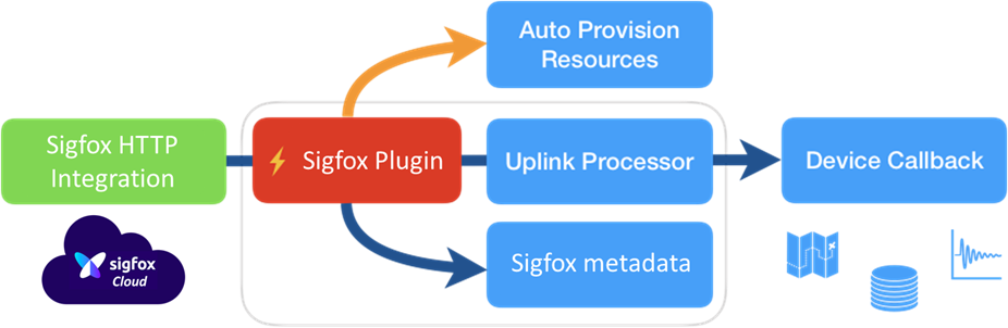 This plugin is an interface for using Sigfox HTTP Callback feature in an optimized way, providing features to easily integrate these devices with Thinger.io Platform, such as automatic device and storage provisioning and both uplink and downlink cloud processing.