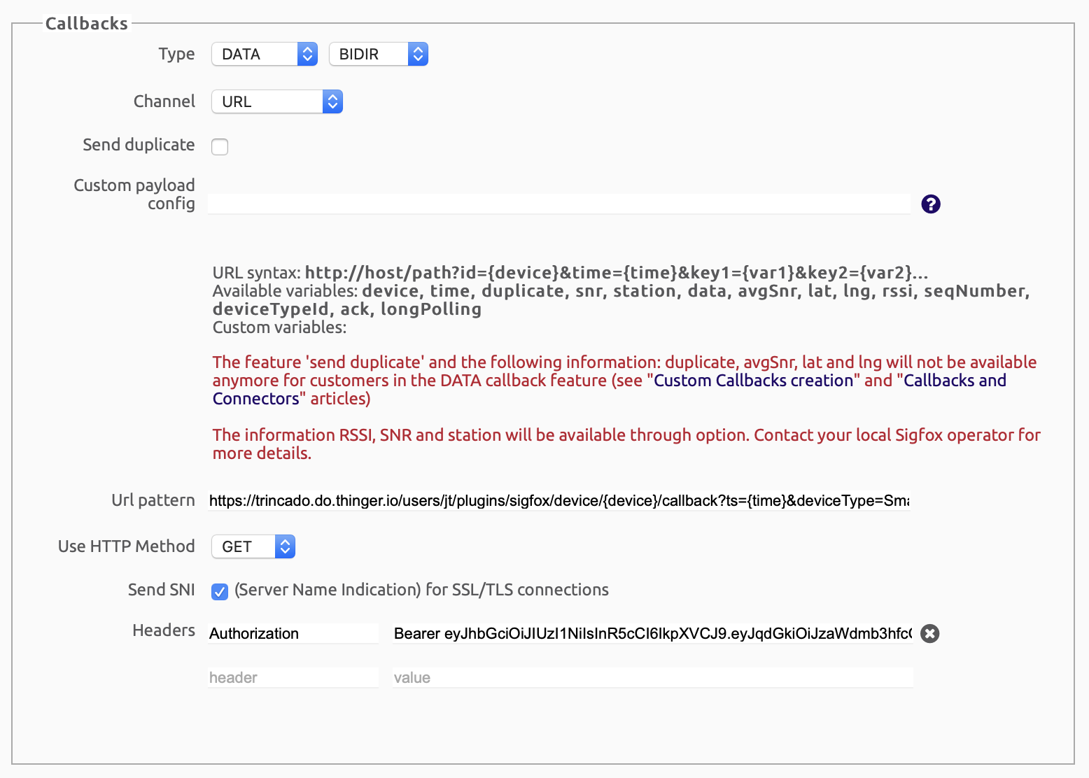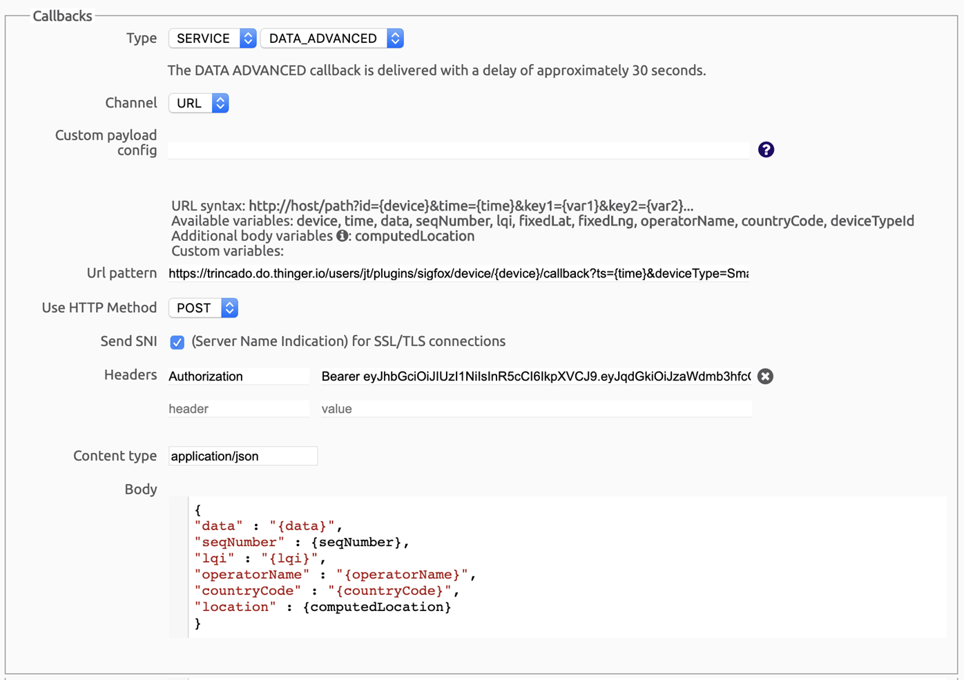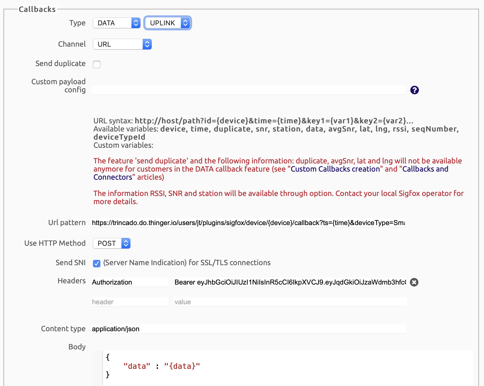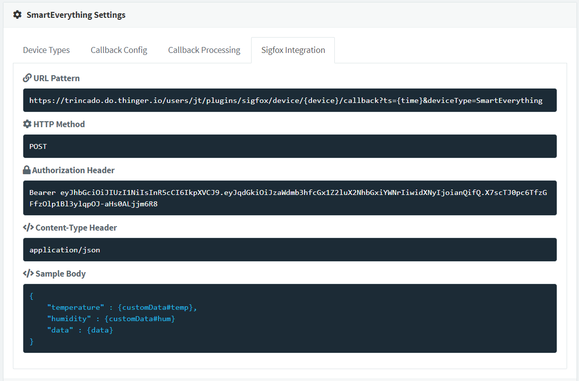 - Authorization Header: must contain the autogenerated authorization to provide Sigfox Cloud the permission to send data to Thinger.io.