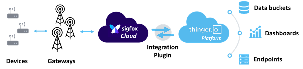 When Sigfox receives a message from any device, it automatically checks its configured integrations to forward them the information received. This plugin is integrated over HTTP, so, the Sigfox network will issue an HTTP request to the Thinger.io plugin on new messages.