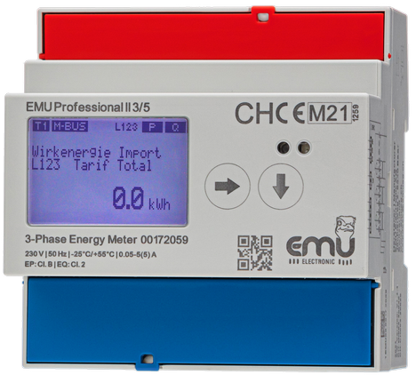 Emu EMU-PROF-II 3-phase energy meter with MID B+D approval for billing purpose. Connection: Direct (100A) or indirect (CT /5 and /1A). Internal clock. External or internal antenna.