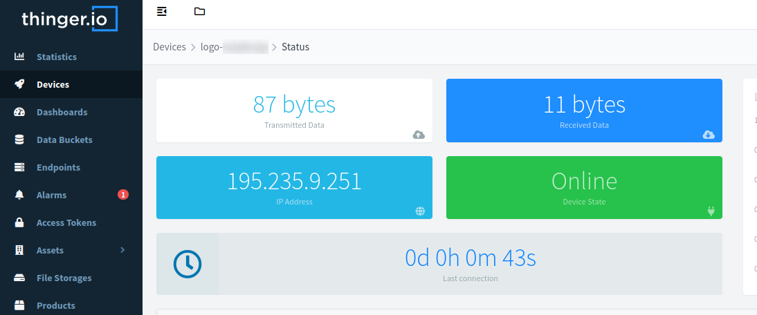 After a few seconds, the device will autoprovision itself on Thinger.io Platform. You can check the device status on the Thinger.io Console.