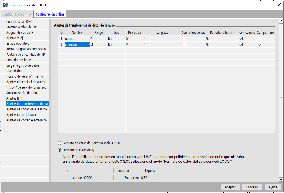 Configure the data registers in the Siemens LOGO! device that you want to exchange with Thinger.io platform.