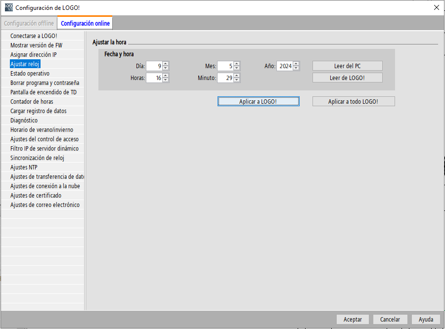 Set the time and date on the Siemens LOGO! through the menu Tools -> Transfer -> Set Time....