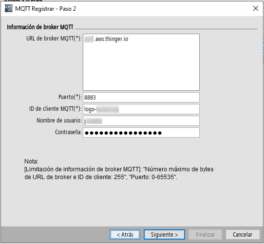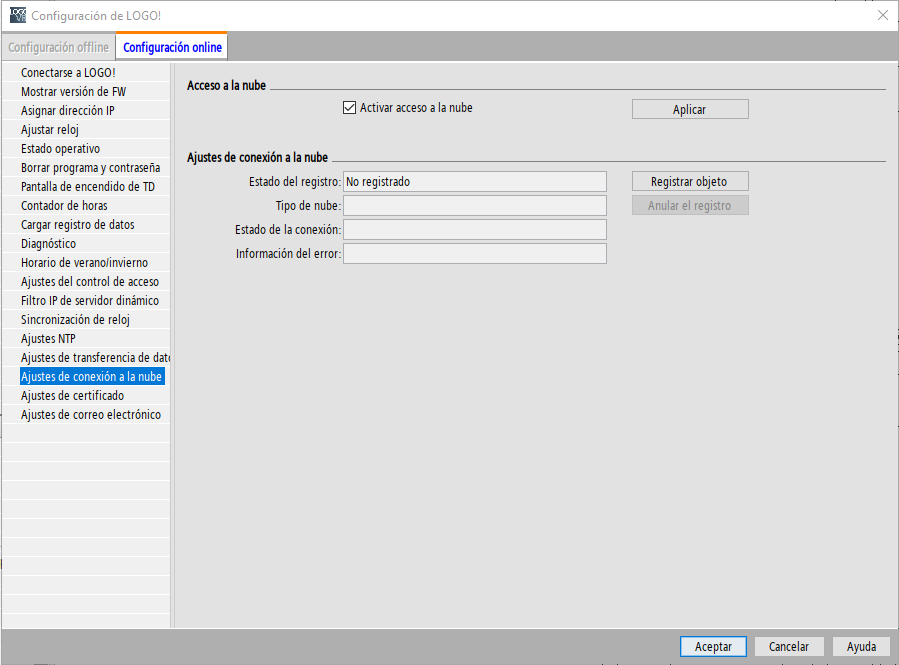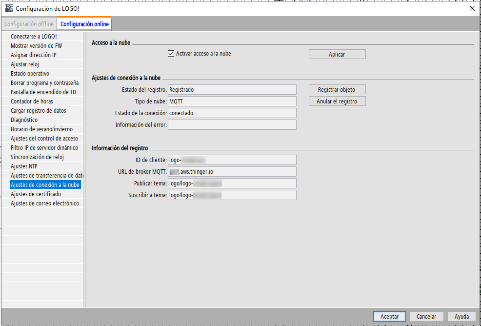 Configure the Siemens LOGO! device to communicate with Thinger.io platform using MQTT protocol. You will need to provide the MQTT broker address, port, username, and password. Go to the menu option Tools -> Transfer -> Cloud settings -> Cloud connection settings and configure the settings as shown below: