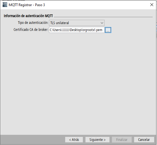 Authenticacion Typethe optionUnilateral TLS. The certificate CA de broker uses can be download from this link, specifically the pem certificateISRG Root X1, valid until 2023-06-04.